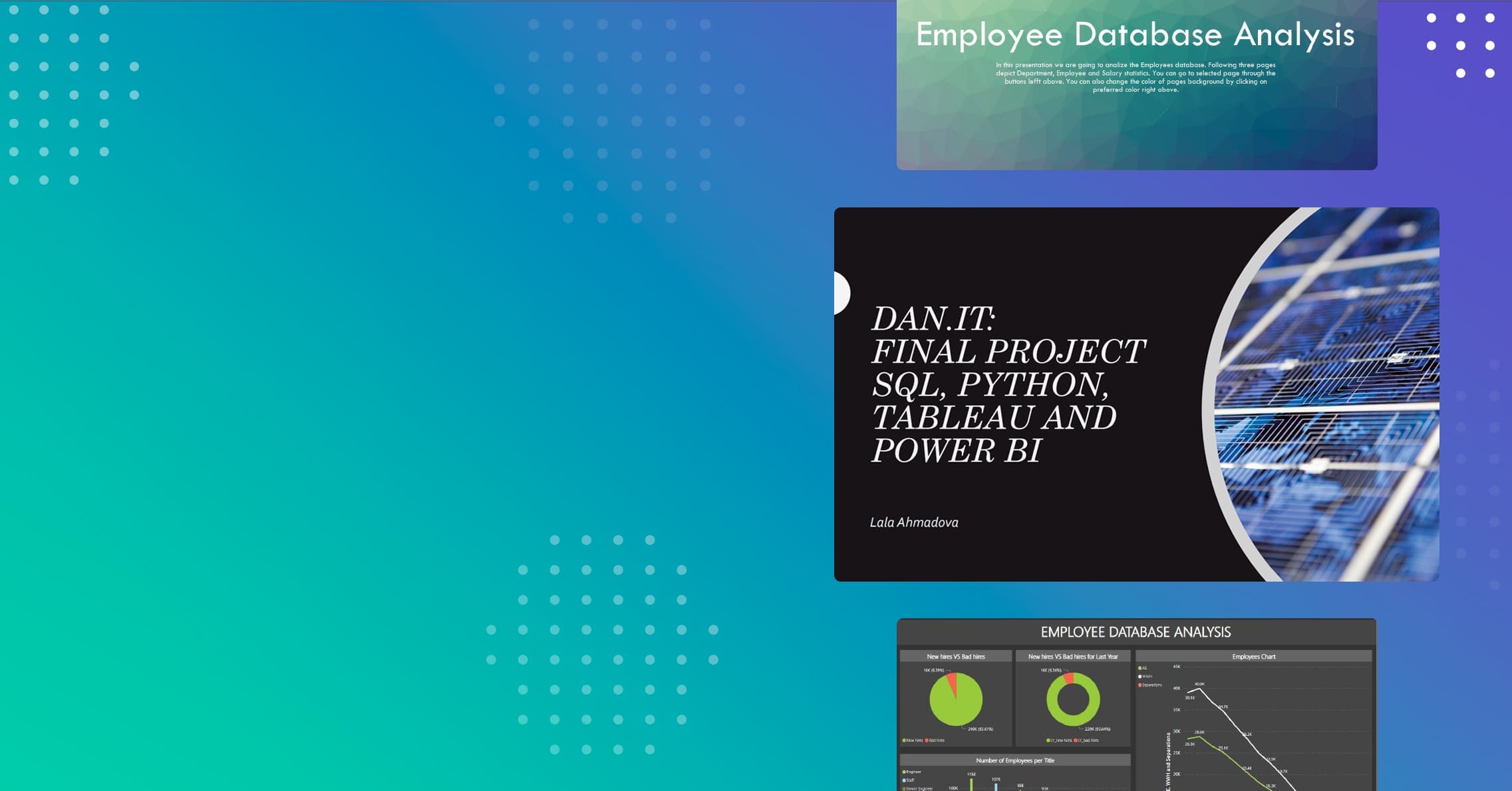 При работе над финальным проектом главными целями студентки было показать ее навыки работы с такими инструментами для отчетности как POWER BI, TABLEAU, а также владение языками программирования Python и SQL. В своей финальной работе выпускница, используя полученные знания, работала над анализом базы сотрудников крупной компании.