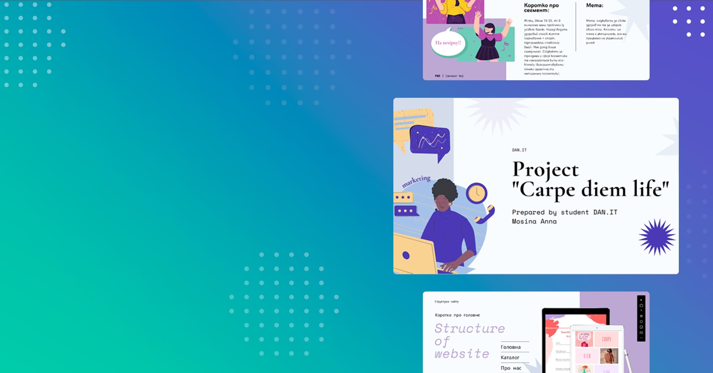Carpe Diem Life – это украинский бренд косметики, основанный на сочетании психологии и диетологии. Опираясь на физиологию человека, команда разработала косметику для женщин, желающих полюбить себя и свое тело. Главная задача: сделать так, чтобы женщины чувствовали себя уникальными! Главной задачей студентки было разработать маркетинговую стратегию, которая поможет бренду выйти на новый уровень и привлечь больше клиентов. Работа над проектом продолжалась 5 месяцев.
