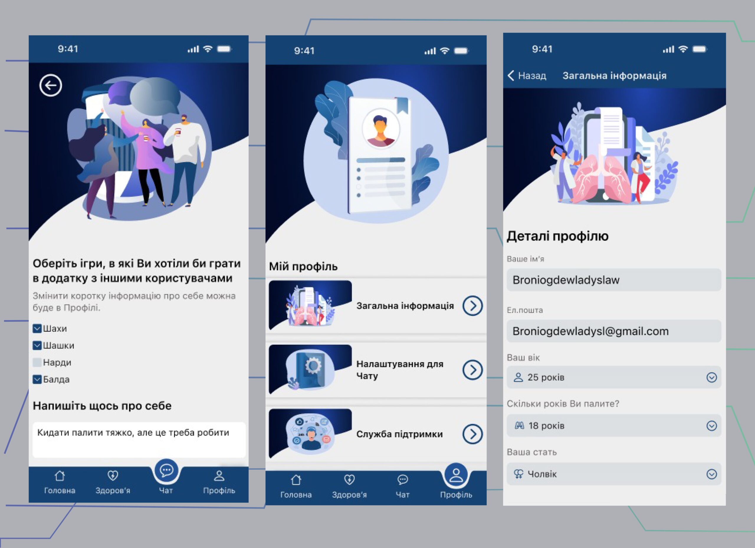 Чтобы человеку было легче бросать курить, был создан чат, где можно пообщаться с единомышленниками, которые только начинают бросать или уже долгое время не курят. Из чата можно пригласить человека, чтобы поиграть в игры, например, шахматы, которые есть в приложении.