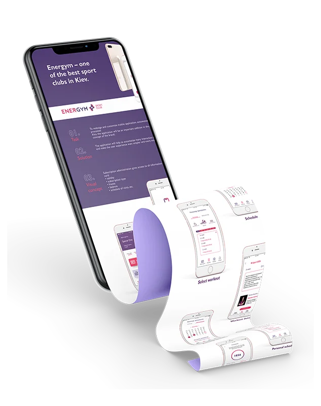 EnerGym — один из лучших спортивных клубов Киева, который имеет сильную базу в социальных сетях. Необходимым следующим шагом в концепции клуба является корпоративное приложение, которое удовлетворило бы потребности руководства EnerGym, реализовало коммуникацию по абонементу и услугам. Ситуация заключалась в том, что у клуба уже было свое приложение, но его необходимо было обновить и сделать удобным для пользования. Также задачей для студентки было реализовать дизайн согласно корпоративной стилистике и в соответствии с трендами.