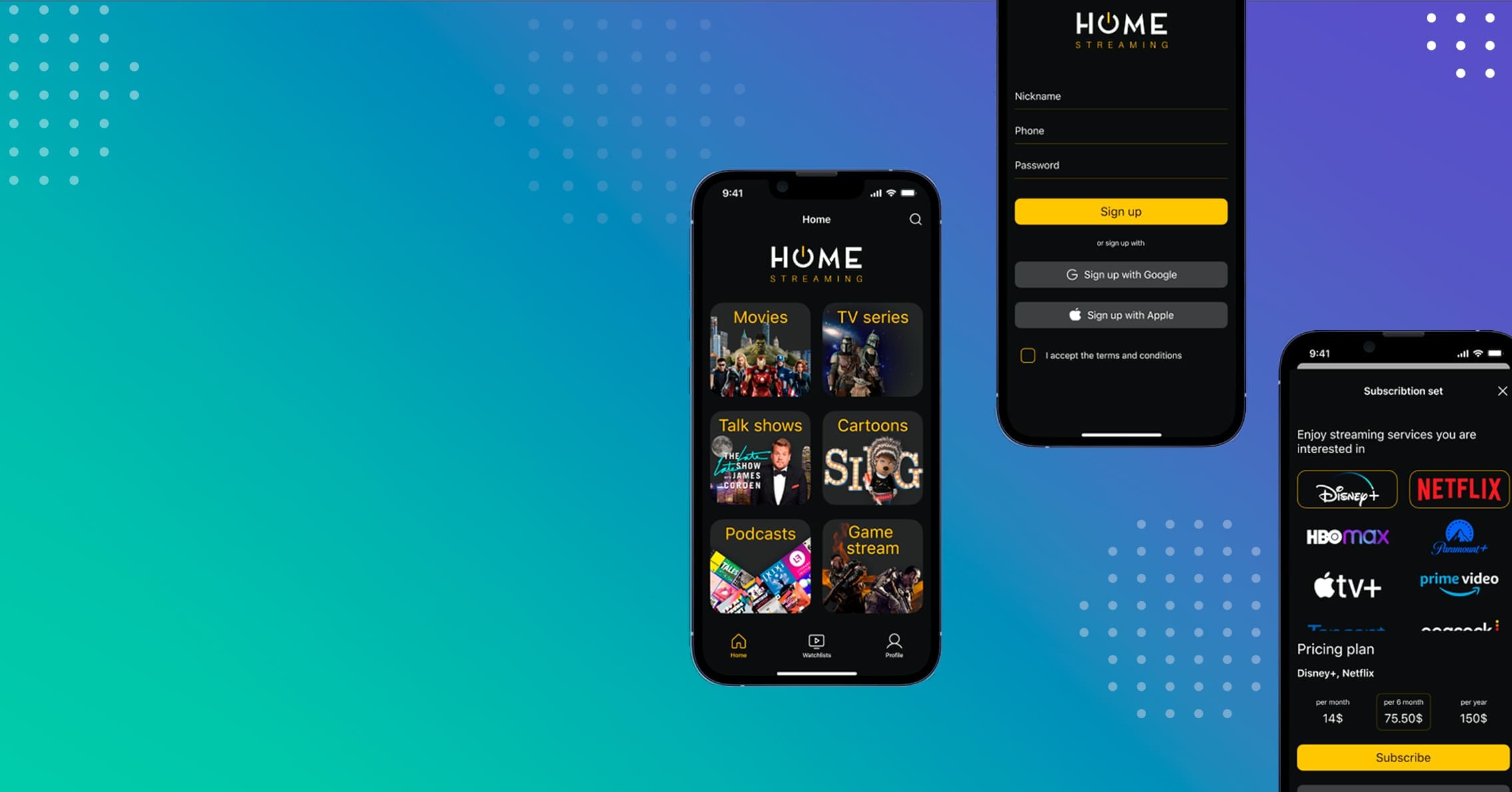 Home streaming – all-in-one стриминговая платформа. Концепция платформы была разработана из-за постоянного роста спроса на потребление видео и аудио контента. Основная цель проекта – объединить контент в одном приложении, что сделает путь пользователя к любимым шоу/подкастам/фильмам гораздо проще. Также необходимо было создать возможность сохранения и распространения контента, трекер релизов и гибкую систему фильтров. Над проектом работала выпускница курса UI/UX-дизайн Юлия Лахно. На подготовку работы студентка потратила 4 недели.