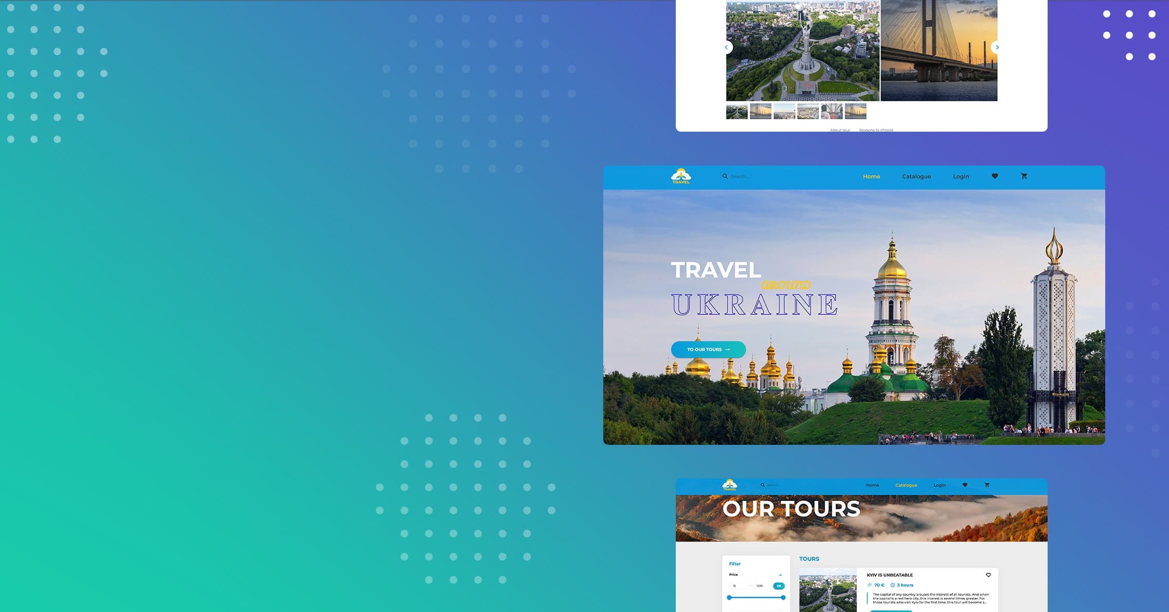 Travel Around Ukraine – интернет-магазин по продаже туров и экскурсий по Украине. Главной задачей студентов было закрепить знания и навыки, полученные во время обучения и разработать в команде одностраничное адаптивное веб-приложение с минималистичным пользовательским интерфейсом, обеспечивающее легкий и удобный UX, чтобы потенциальный клиент мог быстро приобрести туры и экскурсии по Украине, которая, как ожидается, станет туристическим направлением номер один в Европе в ближайшее время, после нашей победы. Над проектом работали 7 студентов группы FE_online(1). Работа продолжалась 3,5 месяца.